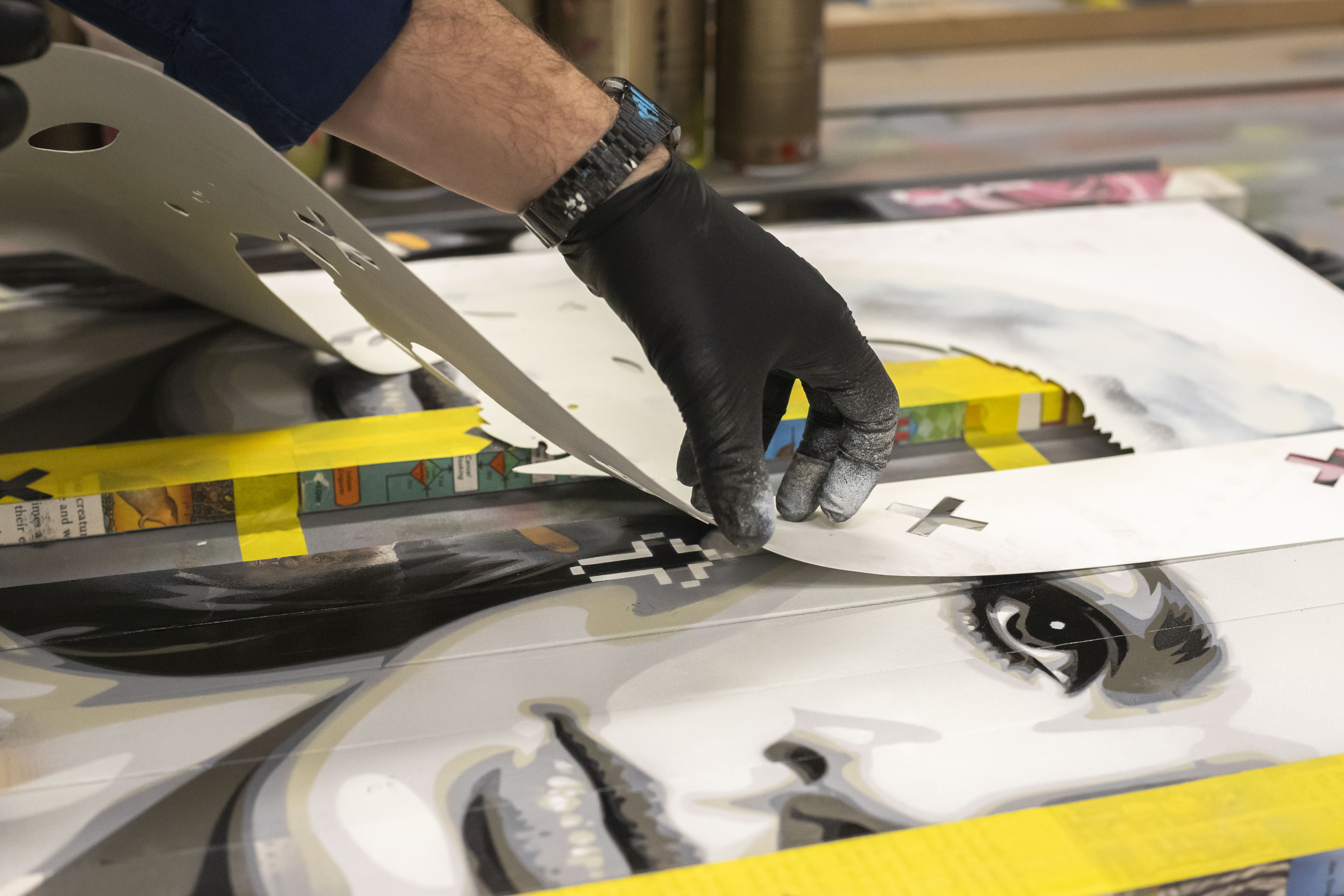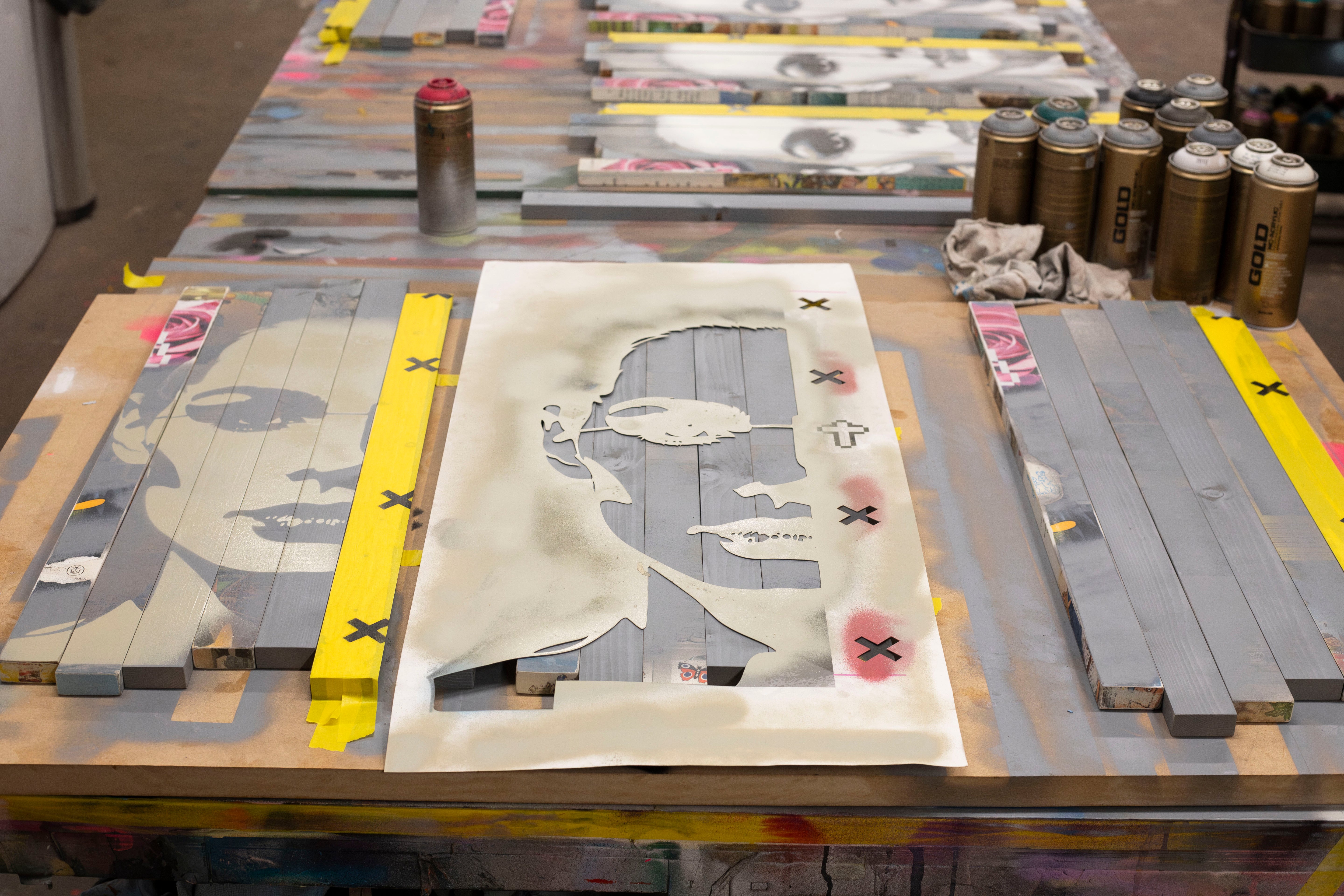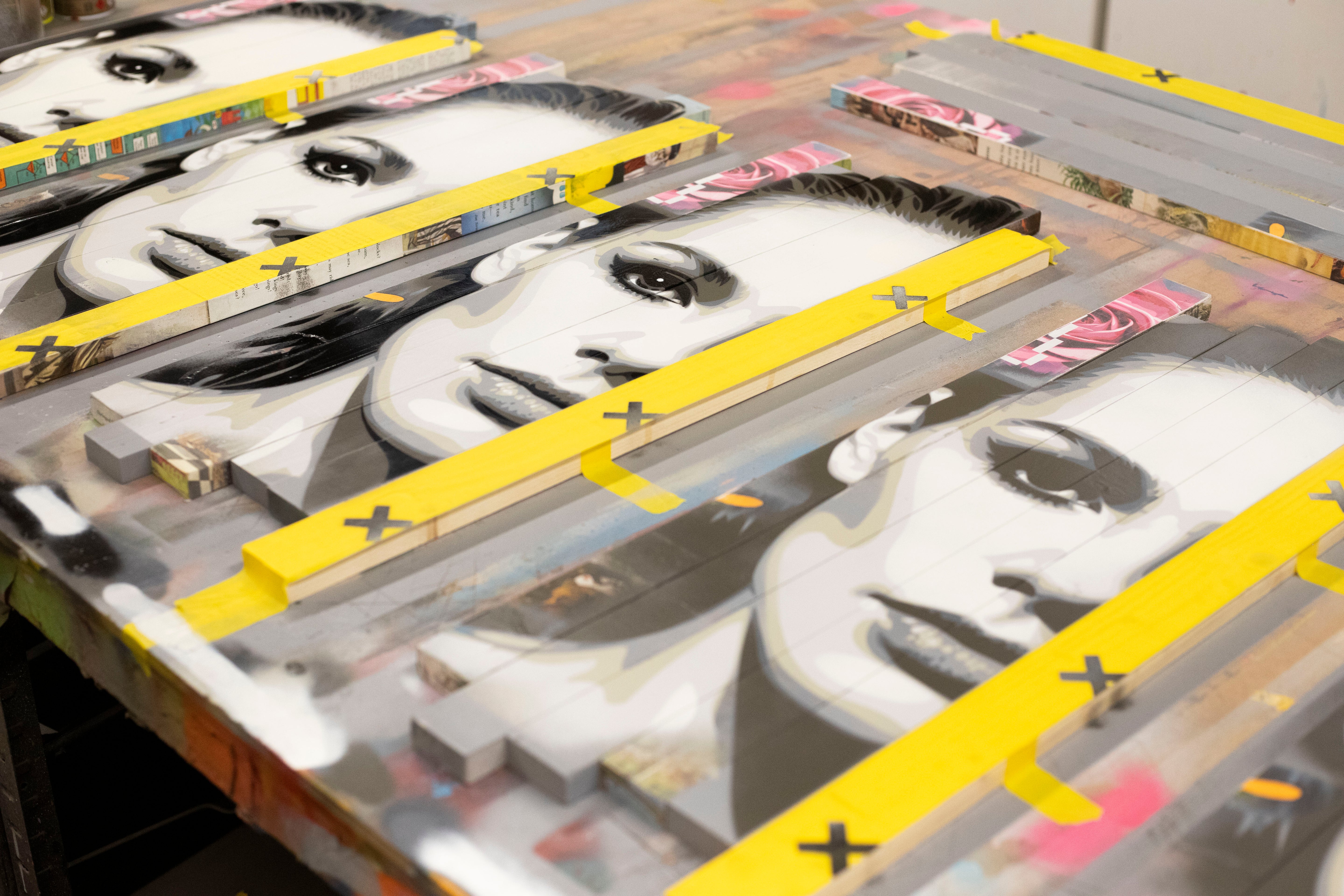 A meticulously handcrafted mixed media edition combining layered aerosol-stencilled portraiture with print collage and vintage book pages, mounted on individually staggered, upcycled timber panels. Each piece features a dynamic surface relief with subtle shifts in depth, highlighting the series’ core theme of misplacement and individuality.